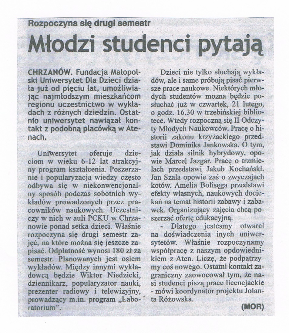 Relacja z imprezy popularno-naukowej pt. „Babcia, dziadek i wnuki dla każdego światło nauki” w programie telewizji Chrzanów z 21 stycznia 2012 roku. Był to wykład dr Andrzeja Janasa z Akademii Górniczo-Hutniczej im. S. Staszica w Krakowie pt. "Co to jest światło?"